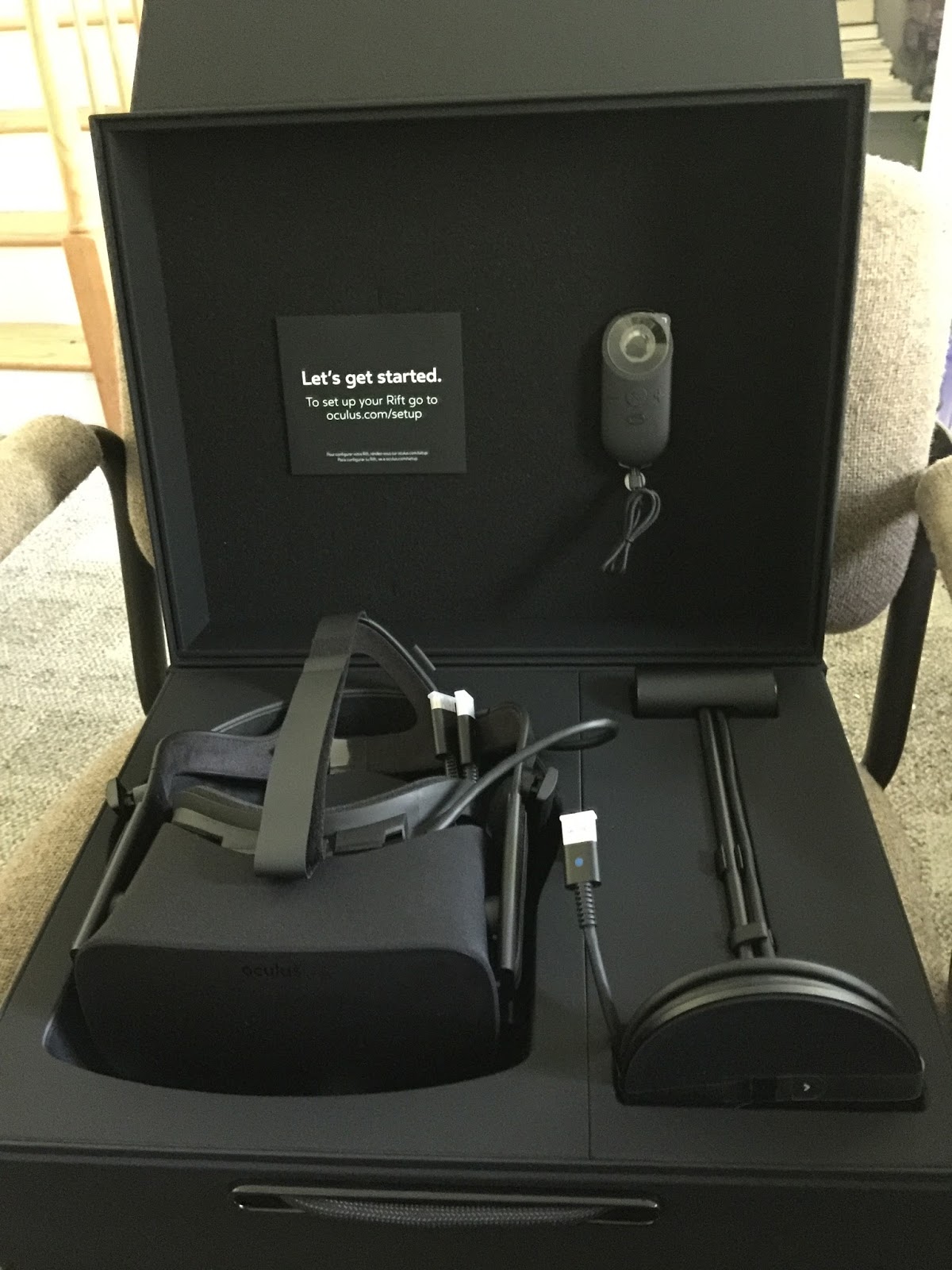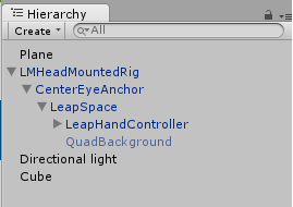 Next I started assembling my own scene to see if I could get the Orion hands to display. I created a new project, set the project build settings for VR (Edit > Project Settings > Player, then ensured that Virtual Reality Supported was checked), and created a basic scene with plane, a cube, and a directional light. After importing the LeapMotion_CoreAsset_Orion_Beta_4.0.1 package, from the LeapMotion assets, I dragged the Prefab > LMHeadMountedRig into the scene.